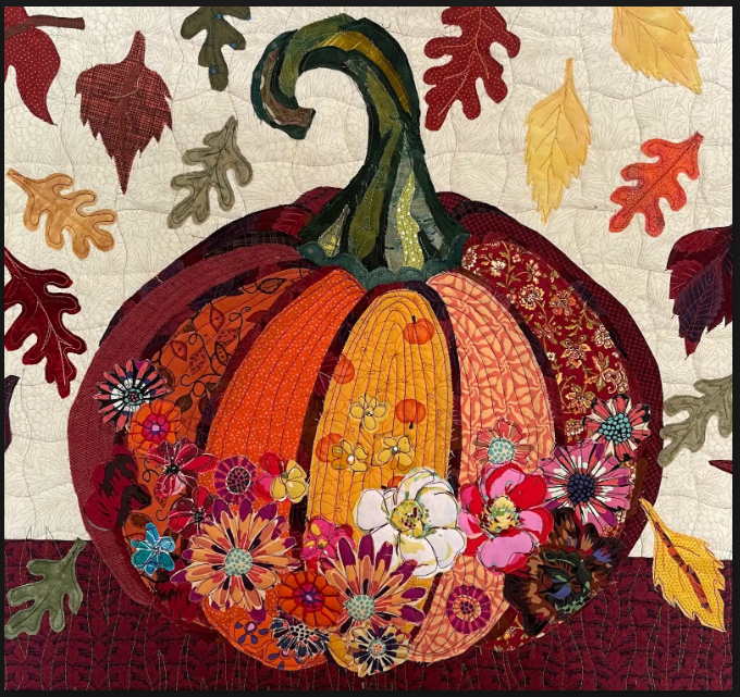 What a perfect time to make a table runner or small wall hanging for the Fall. Combine a large pumpkin or a variety of pumpkins with a number of falling fall leaves. In this workshop we will work on a larger decorated pumpkin and cut a variety of leaves to be included in this project. This project will be completed and stitched at home.